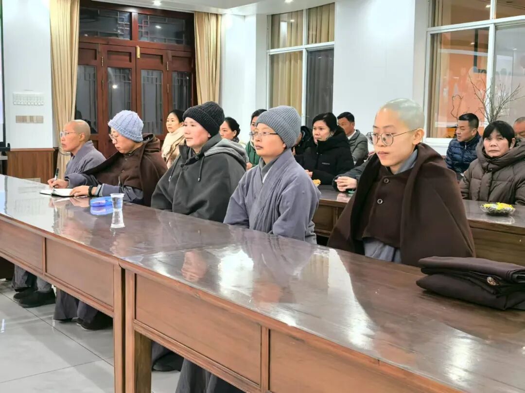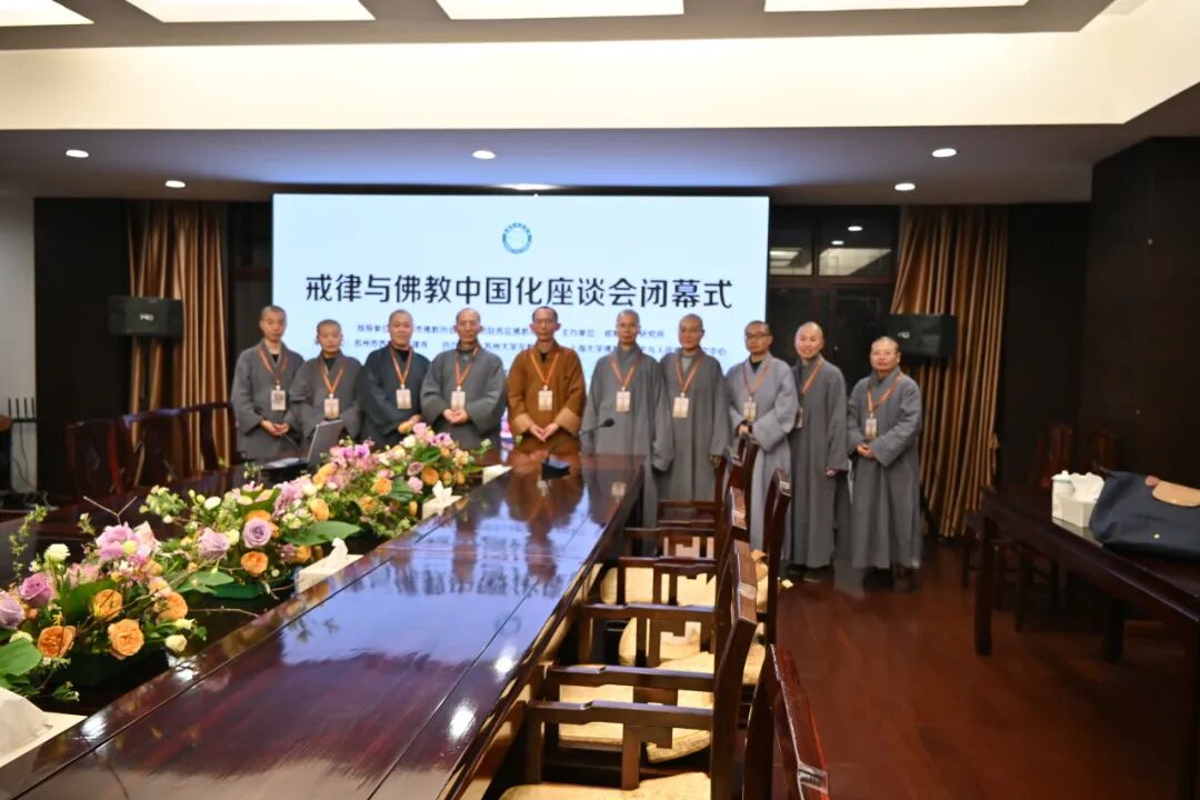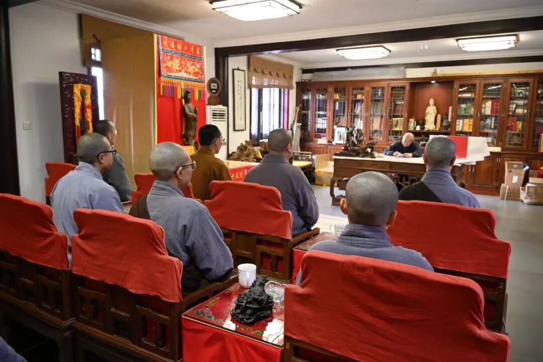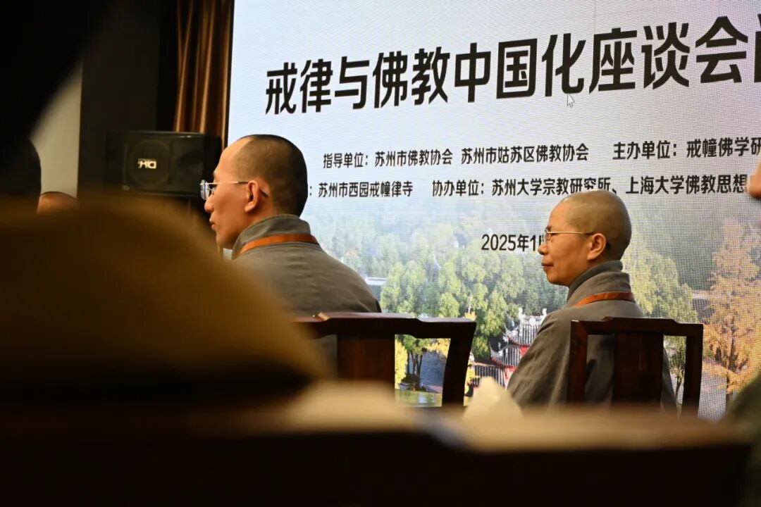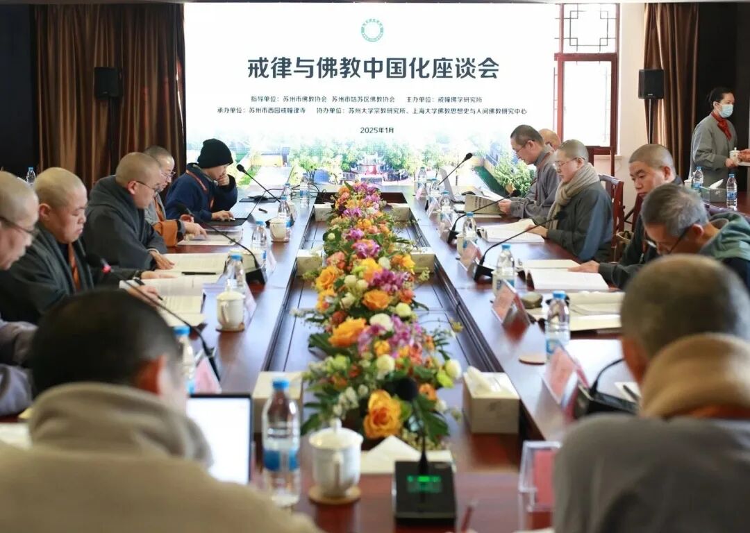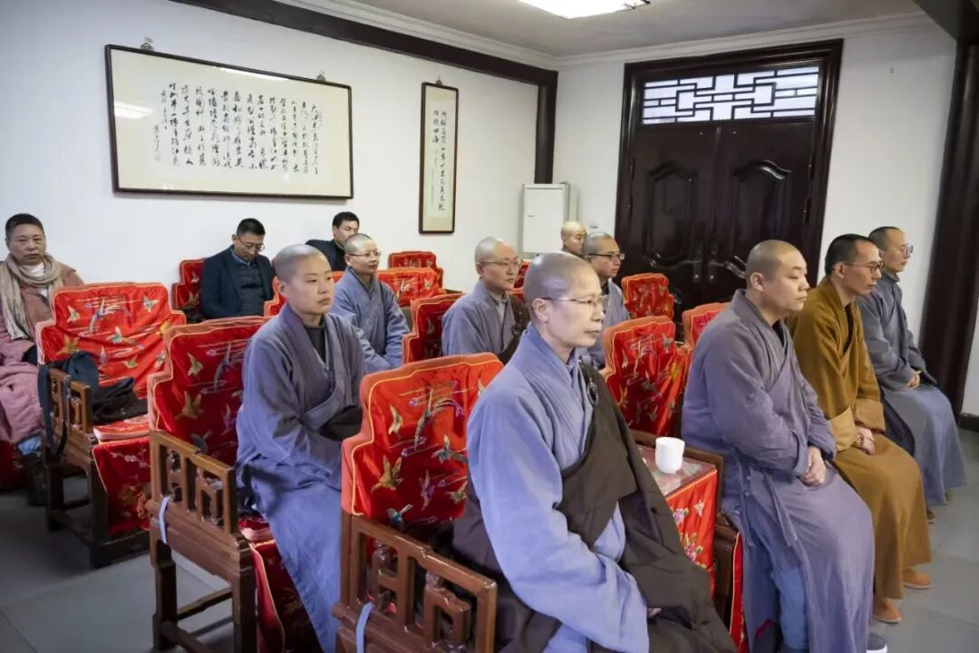 1月18日,广长律院住持上妙下丰律师受邀,偕律院数位僧众前往苏州参加于西园戒幢律寺拈花堂内隆重举行的“戒律与佛教中国化座谈会暨主题书画展”。