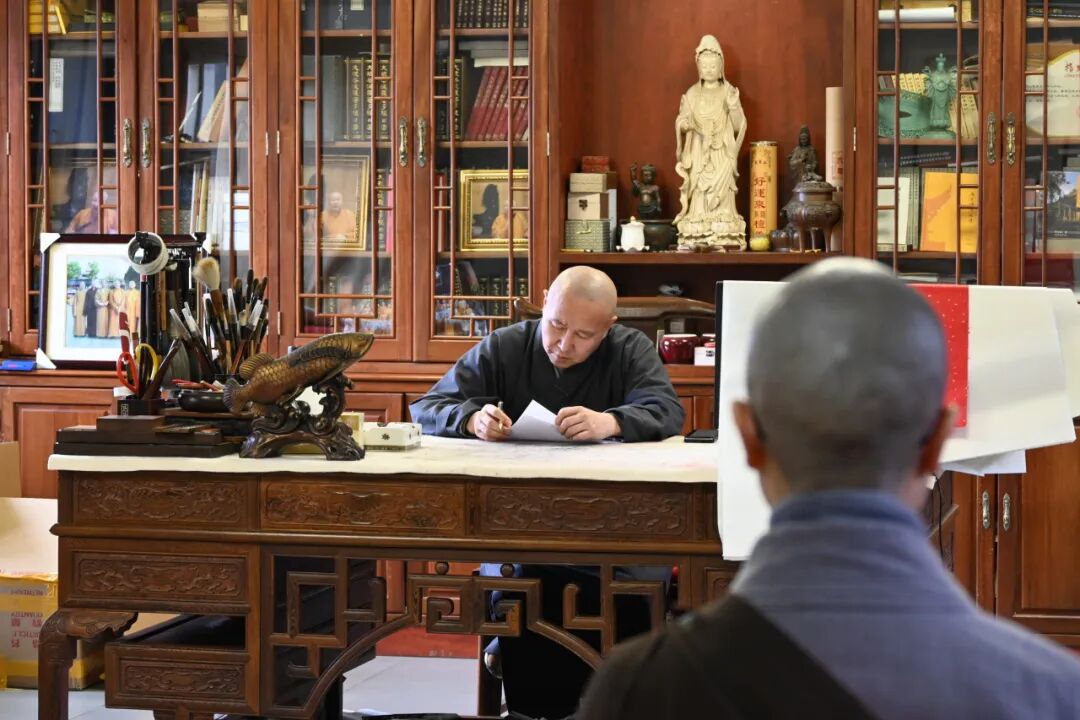 广长律院僧俗弟子拜见了隆昌寺现任住持上心下平大和尚,并有幸亲见大和尚为在佛学院任教、就读的三位青年比丘僧传南山宗与千华系法脉并书写传授法卷,还为诸人赐予了墨宝。上妙下丰律师作为先前已受上心下平大和尚亲传法脉的南山宗与千华系法嗣亦对三位法兄予以至诚的随喜赞叹。