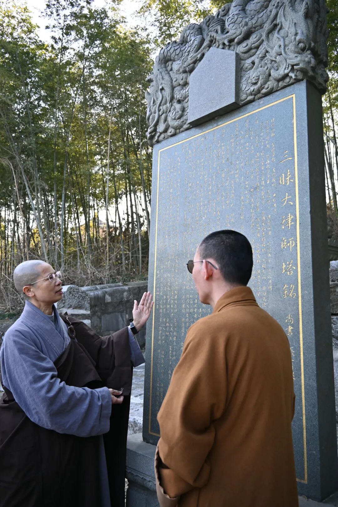 ▲上妙下丰律师在三昧寂光律祖舍利塔前如数家珍,认真介绍明朝尚书张有誉撰写的《三昧大律师塔铭》